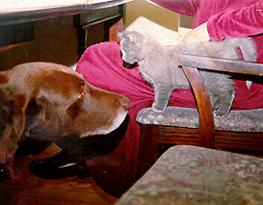 March 3, 1999 Walter died early this morning. February 28, 1999 The last few months have been alternating between positive and negative as Walter improved slightly from his November problems but continued to decline overall. He managed to get around pretty good but it gradually became increasingly difficult for him to stand and move around. The frustration he's been experiencing has become very apparent and we've done everything we can to help him out and minimize the discomfort. Within the last day, we've seen a significant downturn. Walter appears to have given up and has stopped eating. He doesn't seem to be in pain but he has withdrawn into his house and can't be coaxed out. There doesn't seem to be very much we can do for him at this point except try and get him to eat and keep him as comfortable as possible. November 26, 1998 It's been getting increasingly difficult for Walter to stand up and move around. Today was the first time he was unable to get up on his own. We intend to do everything possible to keep him comfortable and alert. He's obviously frustrated by his inability to get where he wants to go but he remains responsive and otherwise appears to be in good spirits. November 25, 1997 Walter's mother (Reuther) dies at the age of 16 in California. Summer 1997 We're out of Walter shirts so our fundraising efforts appear to have been successful. Thanks to everyone! Late Summer 1996 A strange new problem began to appear as the summer drew to a close. Walter was losing strength and unable to keep anything down. A medical exam revealed the existence of a condition known as mega-esophagus, a chronic ailment that prevents dogs from swallowing so that they literally starve themselves to death. Once again, Walter's vet recommended we put him to sleep. (This was something like the third time he did this.) We opted to switch vets and give Walter IV treatment so he could regain his strength. We appealed for information on the condition over the net and what we were able to obtain was enough for us to get him on the right kind of medication. He still has trouble swallowing, he coughs a lot, and he pukes almost every day. But he's not in pain and he's definitely happy, especially now that he has an old friend to keep him company - Naftali, a cat who met Walter as a kitten several years ago and hence developed many doglike qualities.