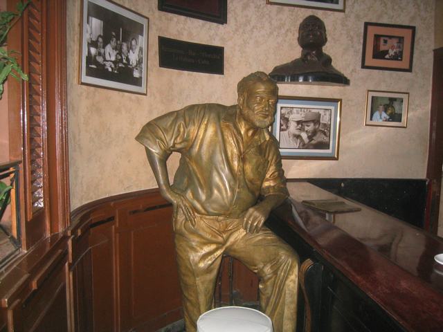 Over at the Floridita bar, a statue of Ernest Hemingway is positioned presumably where (and how) the author himself used to stand. Note the picture of Hemingway with a young Fidel in the background.